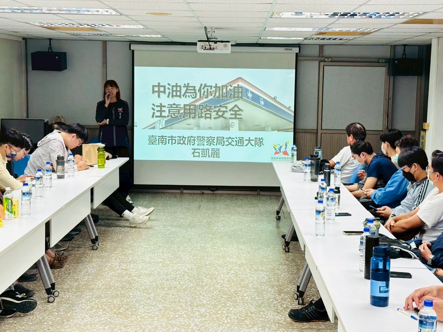 中油公司肩負國內能源運輸重任,部分員工需駕駛油罐車執行勤務,行車安全更顯重要。宣講中特別指出,大型車因車身長、轉彎半徑大,轉彎時容易產生「內輪差」,容易將鄰近機車或行人捲入車底,形成高風險事故情境;再加上車輛高度與結構限制,車側及車頭前方亦存在視野死角,使駕駛人即使依規操作,仍可能因一時未察覺周遭動態而發生意外。因此,交通警察大隊提醒駕駛人轉彎前務必提早打方向燈、減速慢行,並多方確認車輛四周狀況,避免因熟悉路況或一時疏忽而造成憾事。