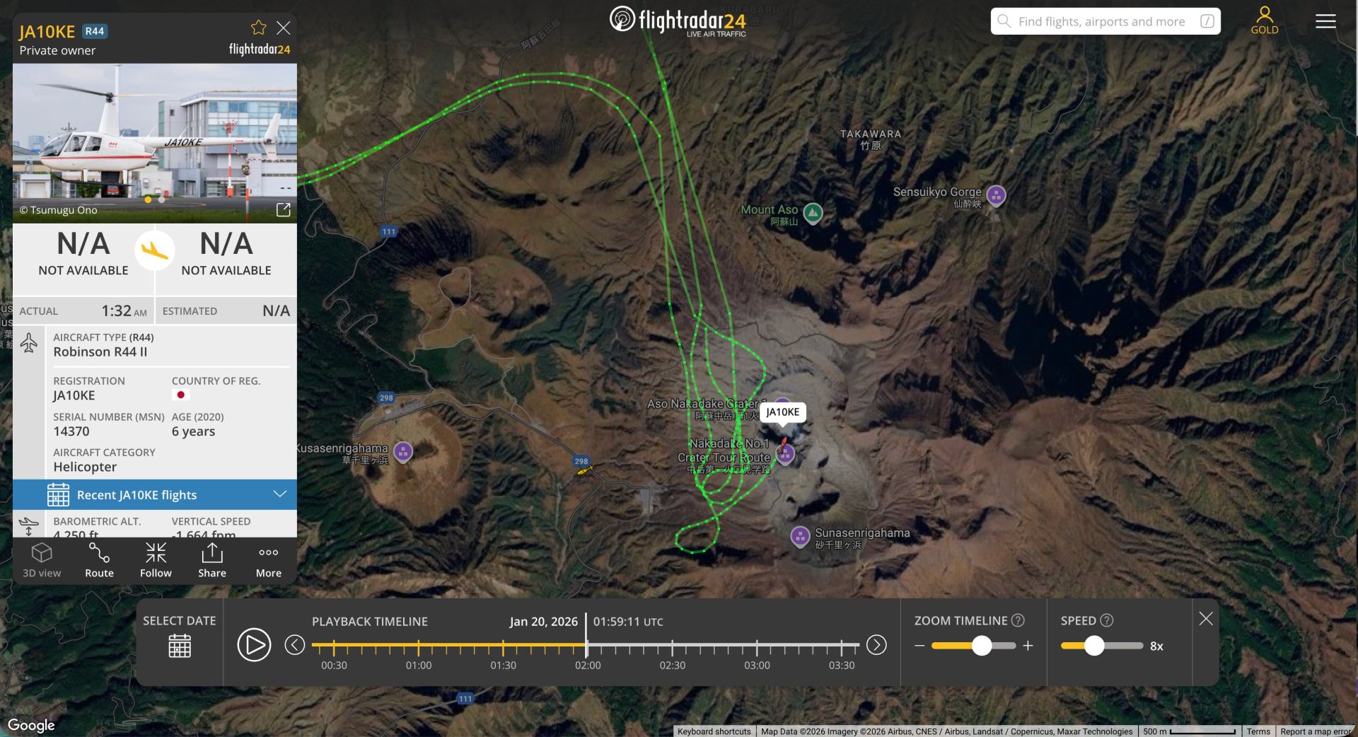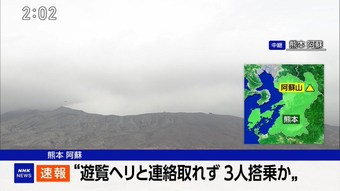 直升機於20日上午10時52分從阿蘇市「阿蘇卡德利動物樂園」起飛,原定飛行10分鐘的火山觀光路線,卻在上午11時左右於中岳火口附近失去通訊,預定返航時間已過仍未歸返,地面控管人員立即通報警消。